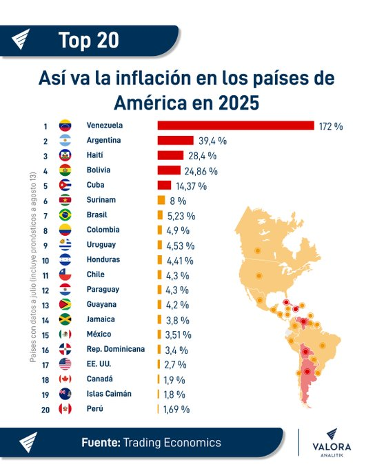 Haití (28,4%) sufre de una inflación elevada debido a una combinación de inestabilidad política, desastres naturales recurrentes que afectan la producción agrícola, una alta dependencia de las importaciones (especialmente de alimentos y combustible, cuyos precios internacionales influyen directamente en la inflación local), y una gobernanza débil que dificulta la aplicación de políticas monetarias y fiscales efectivas. La depreciación de su moneda y la inseguridad generalizada exacerban la situación.