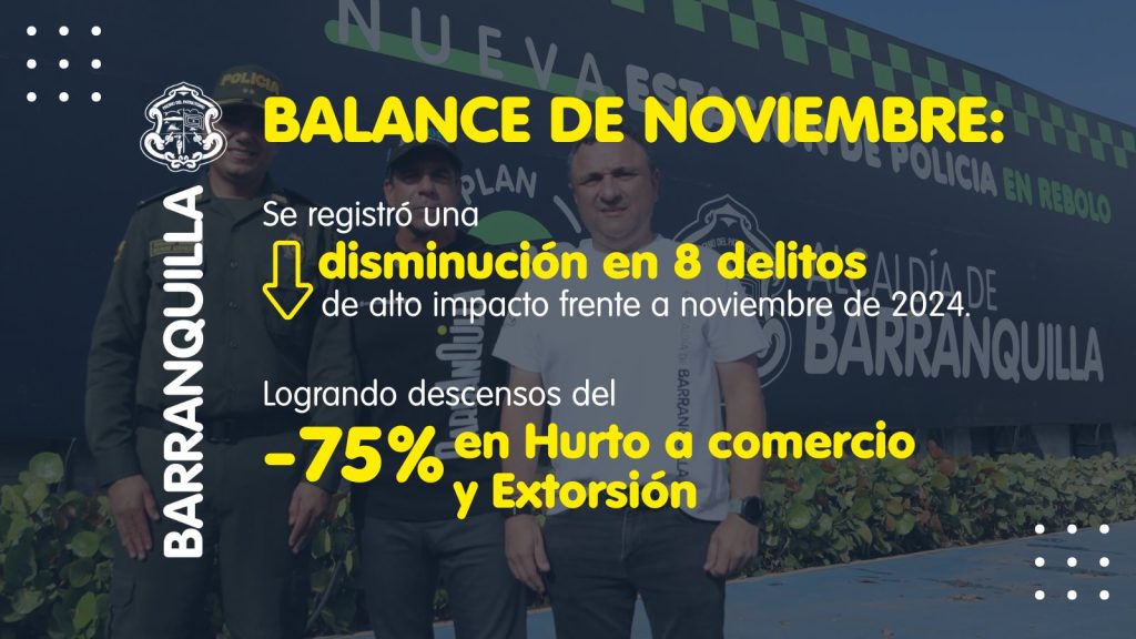 El Distrito de Barranquilla registró en noviembre una de las mayores reducciones de delitos de alto impacto de los últimos años, según balance presentado este domingo por el alcalde Alejandro Char.