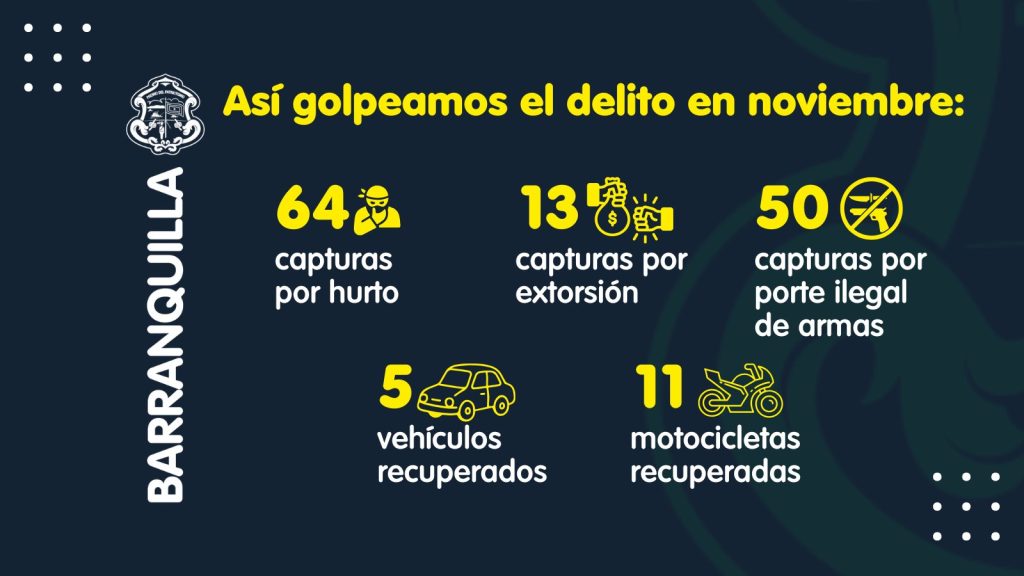“¡Noviembre cierra con más seguridad y menos delitos en Barranquilla!”, celebró el mandatario a través de sus redes sociales, destacando que estos resultados son consecuencia del trabajo articulado entre la Alcaldía, la Policía Metropolitana, la Primera División del Ejército Nacional y la Fiscalía General.