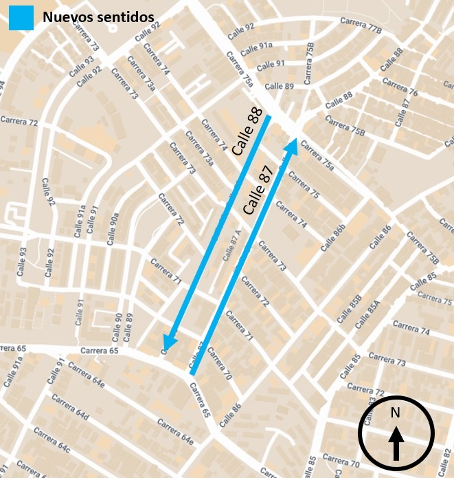 - Calle 88 entre carreras 65 y 75A: pasará de doble sentido a único sentido norte–sur, desde la Vía 40 hacia Villa Carolina.