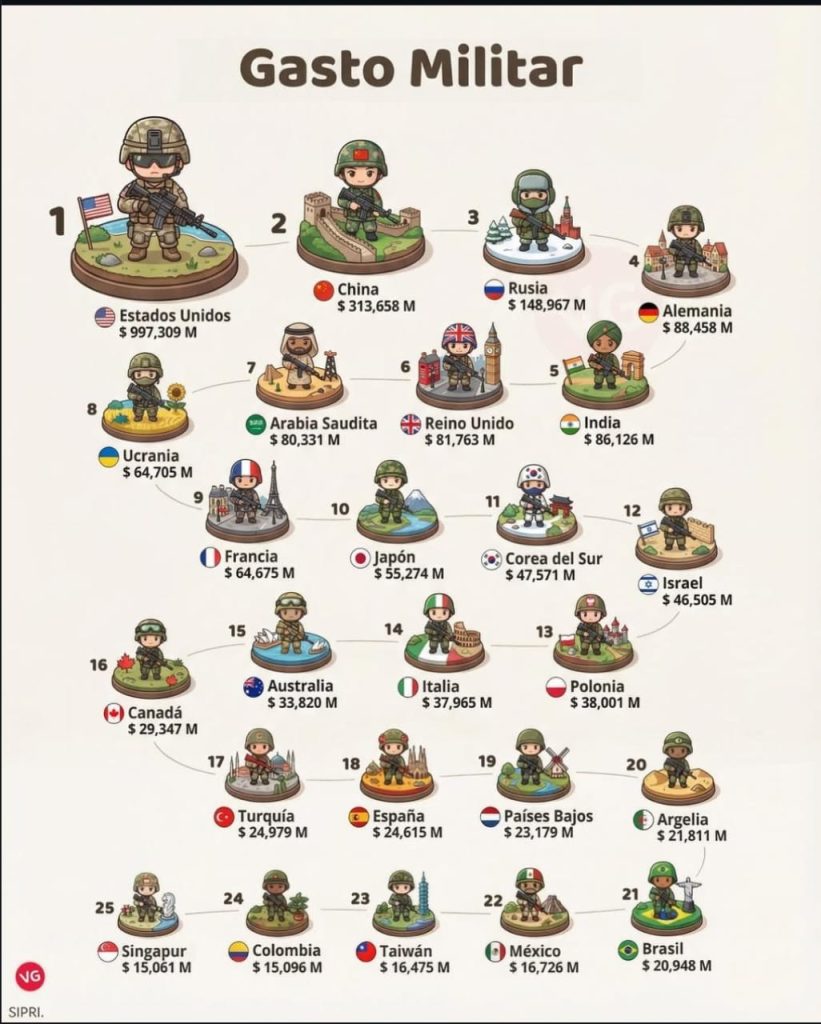 En un mundo que enfrenta crisis climáticas y desigualdades profundas, el gasto militar global ha alcanzado en 205 la asombrosa cifra de 2.718 billones de dólares. Según el SIPRI, este aumento del 9,4% no es solo una estadística económica; es un síntoma de una era donde las potencias y naciones emergentes parecen haber decidido que el blindaje de sus fronteras es mil veces más urgente que el combate a la pobreza o la garantía de derechos básicos como la salud y la educación.
