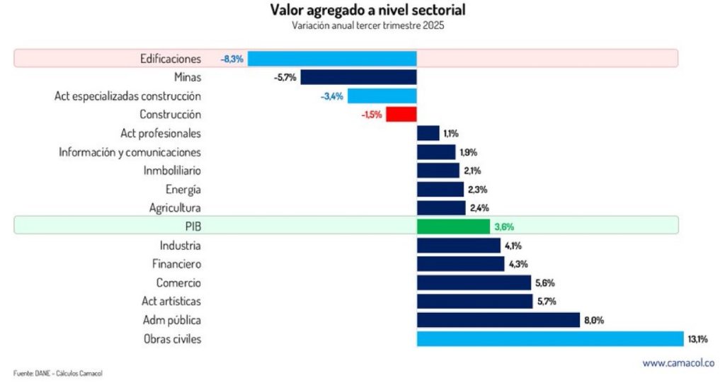 La Cámara Colombiana de la Construcción (Camacol) calificó este martes de “crítica y sin precedentes” la situación del subsector de edificaciones tras conocerse que, según el DANE, entre julio y septiembre de 2025 registró una contracción del 8,3 %, completando así nueve trimestres consecutivos en terreno negativo.