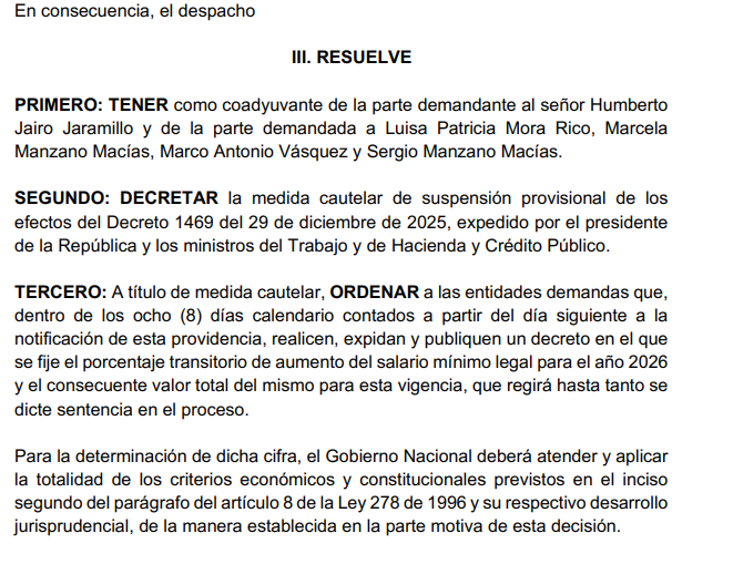 En una decisión que ha generado gran impacto en el país, el Consejo de Estado decretó la suspensión provisional de los efectos del Decreto 1469 de 2025, con el que el Gobierno del presidente Gustavo Petro fijó un aumento del 23,7 % al salario mínimo para este año, llevando el valor base a $1.750.905 (más auxilio de transporte, cerca de $2 millones en total). Esta es una medida cautelar temporal, no definitiva, y el alto tribunal le dio al Gobierno ocho días calendario para expedir un nuevo decreto transitorio que corrija las fallas detectadas.