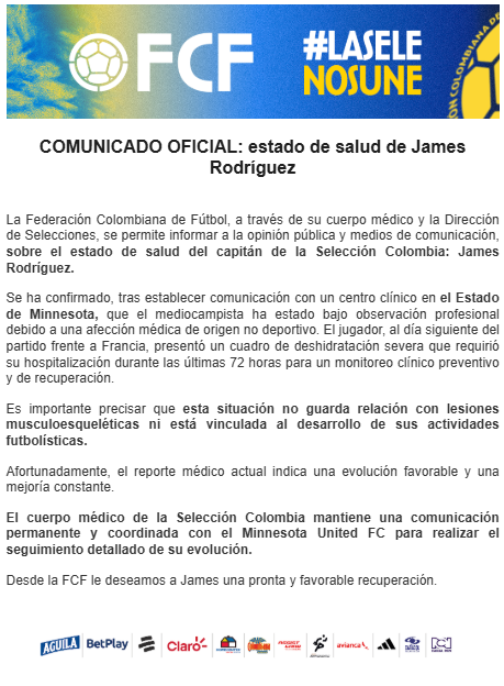 La Federación Colombiana de Fútbol (FCF) emitió un comunicado oficial el jueves 2 de abril en el que confirma que, al día siguiente del partido contra Francia (disputado el 29 de marzo en Washington), James presentó esta afección. La hospitalización se realizó en un centro clínico del estado de Minnesota “para un monitoreo clínico preventivo y de recuperación”. La FCF subraya que se trata de una afección médica de origen no deportivo, es decir, no relacionada directamente con una lesión muscular o golpe en el campo.