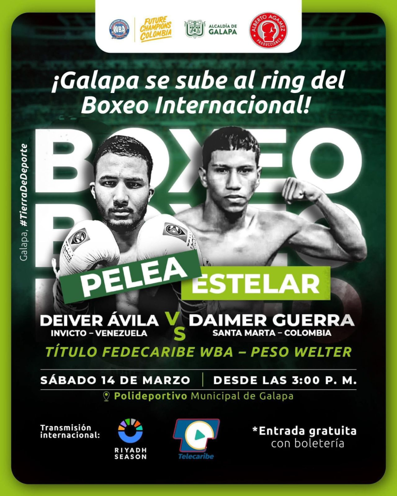 La gran pelea estelar de la noche pondrá frente a frente al invicto venezolano Deiver Ávila y al samario Daimer Guerra. Ambos pugilistas se disputarán el prestigioso Título Fedecaribe WBA en la categoría de Peso Welter, en un combate pactado a 8 asaltos que ha generado gran expectativa entre los especialistas del deporte de las narices chatas.