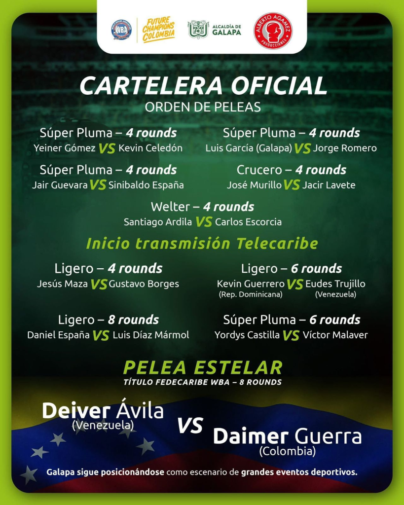 La jornada iniciará desde las 3:00 P. M. con una serie de combates preliminares que incluyen a boxeadores de República Dominicana y Venezuela, consolidando a Galapa como un escenario clave para eventos deportivos de gran magnitud.