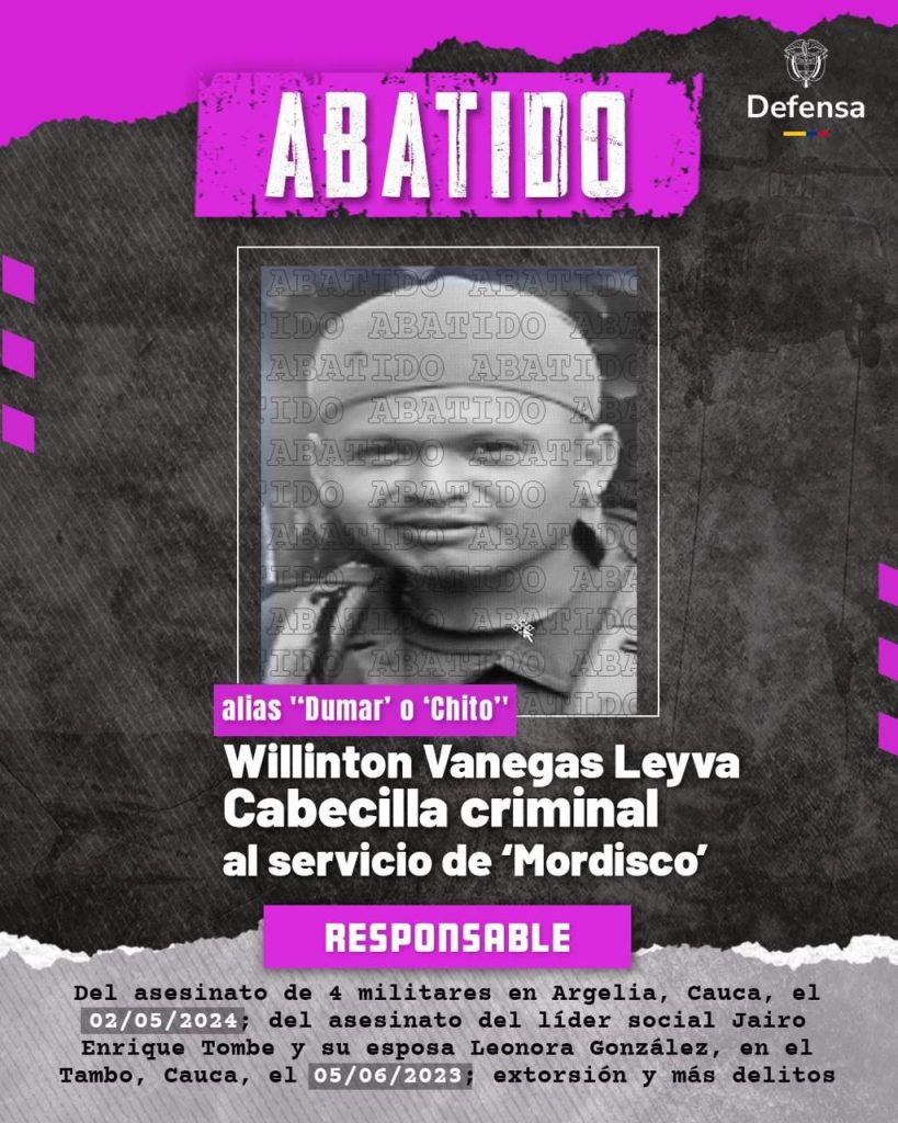 El Ejército Nacional confirmó la muerte en operaciones militares de alias “Dumar” o “Chito”, señalado como uno de los principales cabecillas de las disidencias de las FARC al mando de Iván Mordisco.