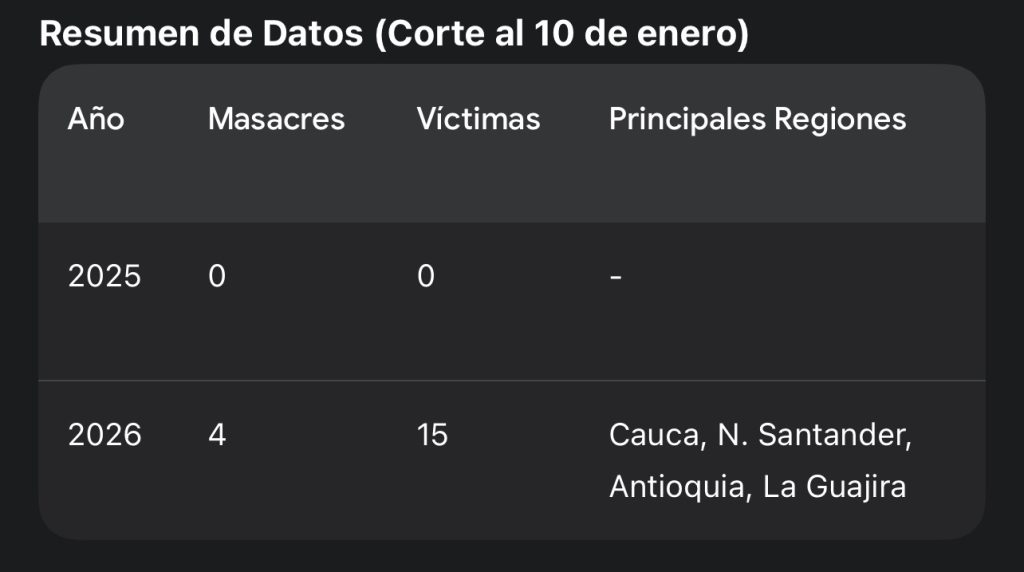 El inicio del año 2026 en Colombia ha estado marcado por un recrudecimiento de la violencia que ya supera los registros del mismo periodo en años anteriores. Con el reciente hecho violento en Maicao, La Guajira, el país alcanza una cifra dolorosa: 4 masacres en apenas 10 días, dejando un saldo de 15 víctimas mortales.
