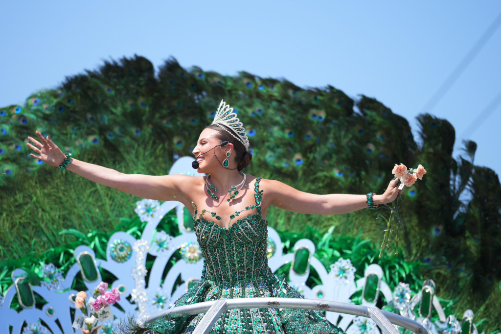 La Reina del Carnaval Michelle Char Fernández, vestida como una diosa esmeralda que brilló con luz propia, lideró el majestuoso recorrido desde su carroza ‘Regina Imperatrix’, un trono en movimiento con una estructura nacida de una gran corona plateada y detalles finos que cautivaron al público.