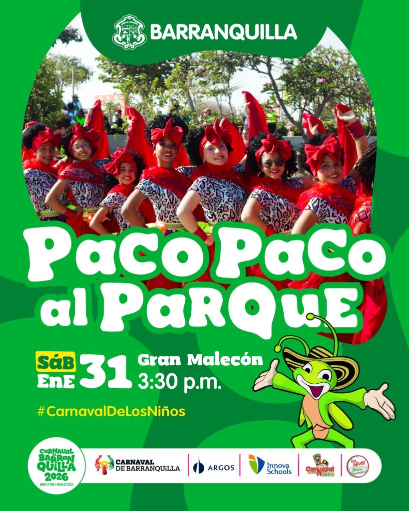 La agenda arranca el sábado a las 3:00 p. m. con el espacio infantil Paco Paco. El evento contará con un concierto especial de Innova School y la presencia de talentos infantiles de La Voz. Bajo la alegría de los Reyes del Carnaval de los Niños, Sharon Acosta y Joshua Torres, se presentarán grupos emblemáticos como las /Marimondas Kids de San Roque y la Cumbiamba Infantil La Soberana, asegurando el relevo generacional de la fiesta.
