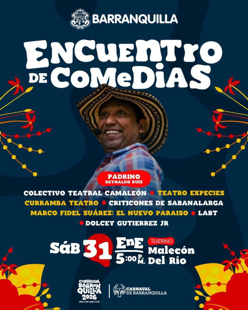 Al caer la tarde del sábado, exactamente a las 5:00 p. m., el tono cambiará hacia las artes escénicas. El Encuentro de Comedias contará con colectivos como Camaleón y Curramba Teatro, apadrinados por el cuentero Reinaldo Ruiz. Esta jornada, que rescata la tradición oral y la sátira barranquillera, cerrará con broche de oro gracias a la presentación musical de Dolcey Miguel Gutiérrez.