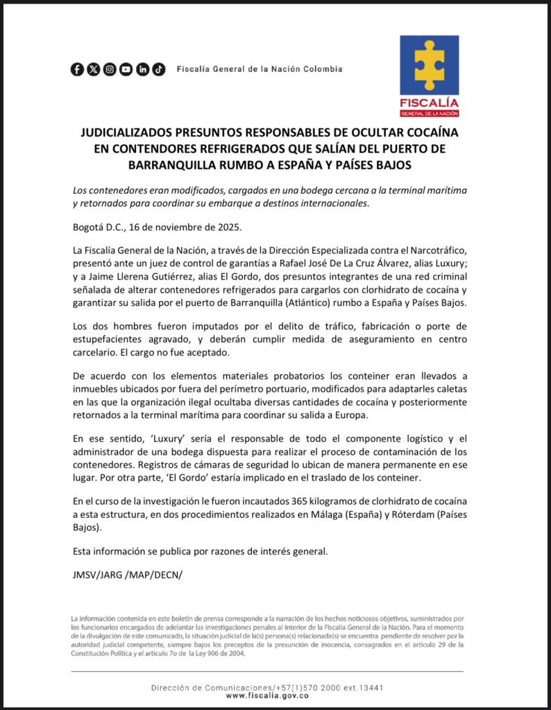 La Fiscalía General de la Nación logró que un juez de control de garantías impusiera medida de aseguramiento en establecimiento carcelario a Rafael José De La Cruz Álvarez, conocido con el alias “Luxury”, y a Jaime Llerena Gutiérrez, alias “El Gordo”, señalados de pertenecer a una organización criminal dedicada a exportar clorhidrato de cocaína hacia Europa oculto en contenedores refrigerados que salían del puerto de Barranquilla con destino a España y Países Bajos.
