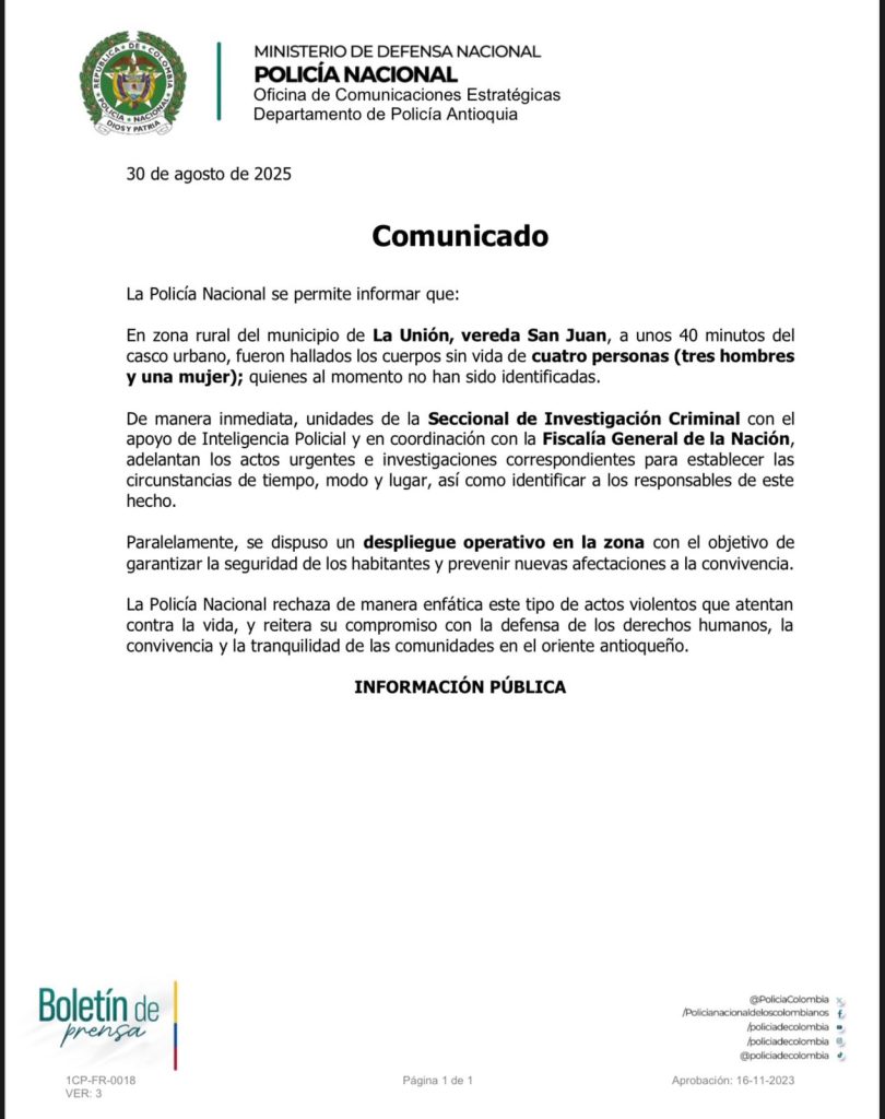 La Policía confirmó una nueva masacre en el oriente de Antioquia. En la vereda San Juan, zona rural del municipio de La Unión, fueron hallados los cuerpos de cuatro personas: tres hombres y una mujer.