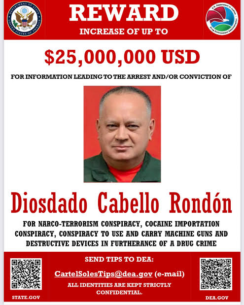 El Departamento de Estado de Estados Unidos ofrece hasta 25 millones de dólares por información que lleve al arresto y condena de Cabello. Esta cifra se aumentó en enero de 2025 y sigue vigente.