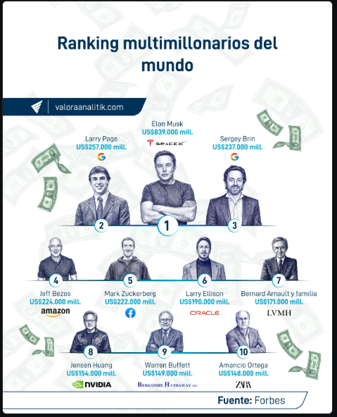Lo que más llama la atención de este listado no es solo que Musk sea el número uno, sino la distancia que ha marcado. Con una fortuna de US$839.000 millones, casi triplica a su seguidor más cercano, Larry Page.