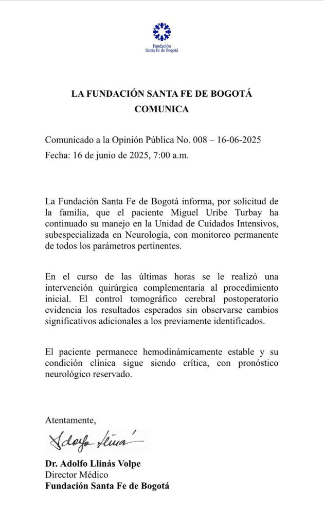 La Fundación Santa Fe emitió un nuevo parte médico del senador Miguel Uribe Turbay, quien fue víctima de un atentado en Bogotá el pasado sábado 7 de junio.Según la clínica, “el paciente permanece hemodinámicamente estable y su condición clínica sigue siendo crítica, con pronóstico neurológico reservado”.