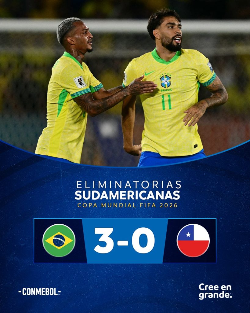 Brasil se impuso con autoridad ante Chile por 3‑0, consolidando su segundo lugar en la clasificación y dejando a la ‘Roja’ sin posibilidades de clasificación.